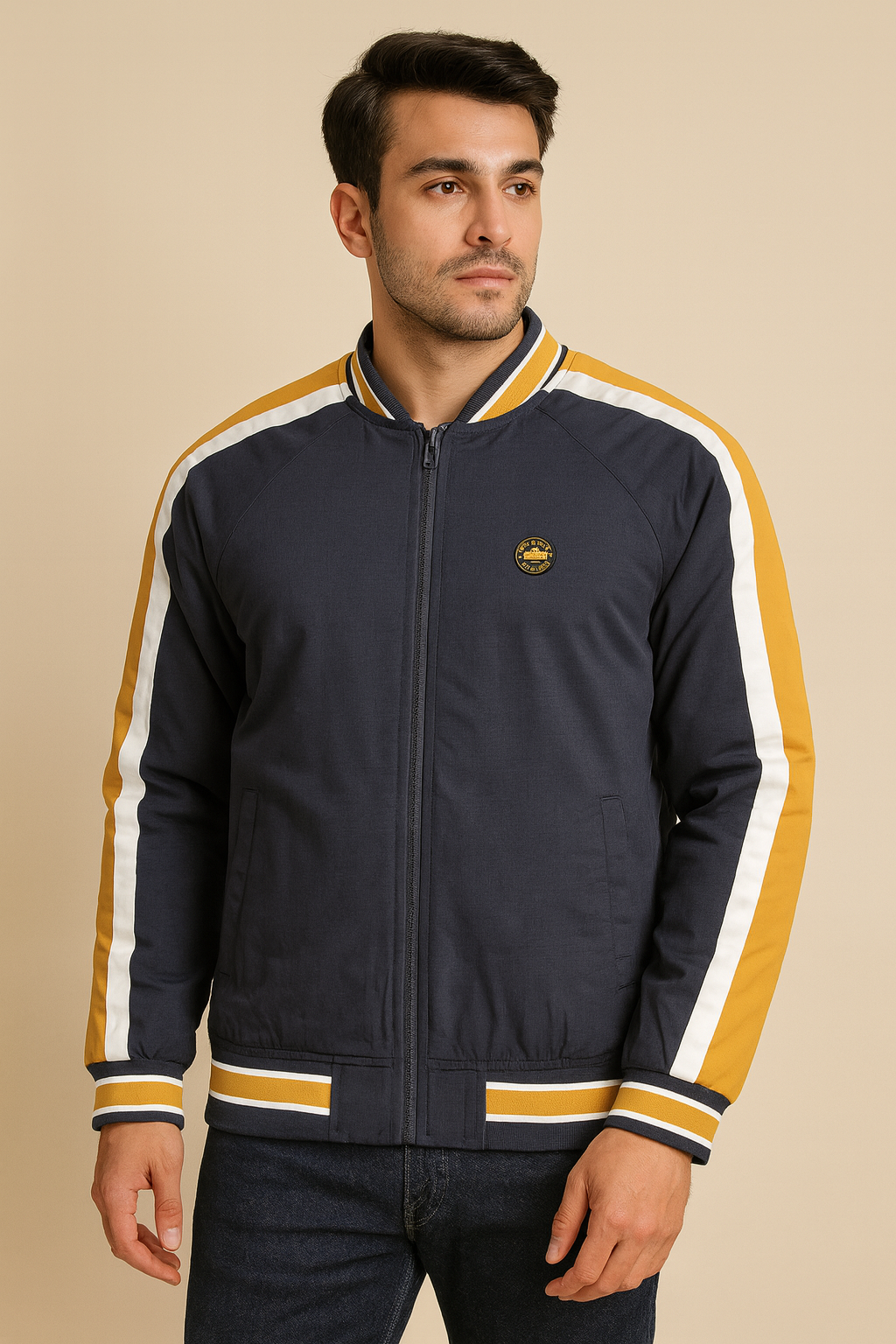 This Flying Machine Bomber Jacket brings a sporty and high-fashion vibe to your winter look. The navy base with mustard & white stripes makes this piece stand out instantly.